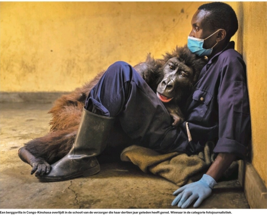 Een prachtige foto van een gorilla en zijn/haar verzorger, vandaag in de Volkskrant. Totdat je het onderschrift leest: deze bergaap overlijdt in de armen van zijn redder. Dan is het behalve een hele mooie en bekroonde foto plots ook een erg trieste plaat.