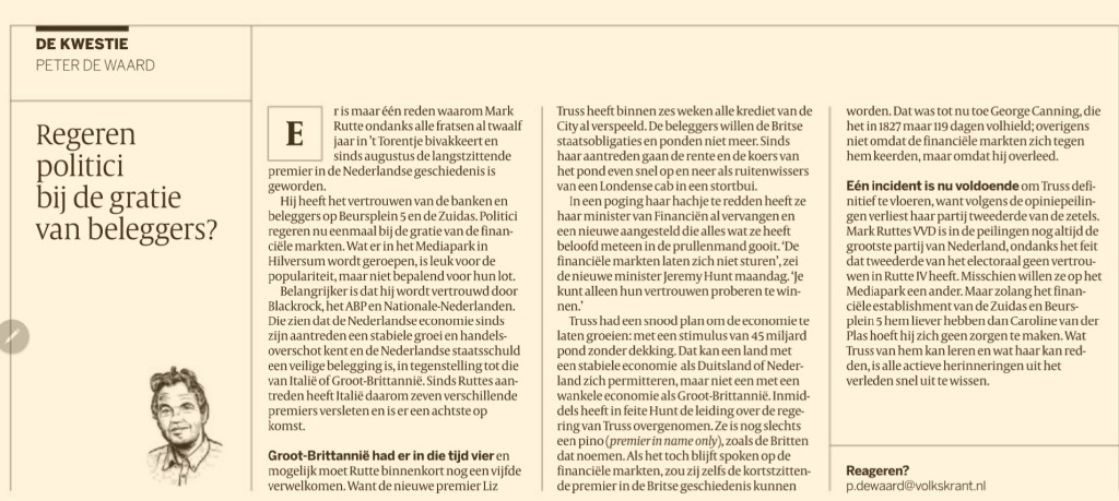 Haarfijne analyse vandaag in de Volkskrant waarin wordt uitgelegd waarom Liz Truss in Engeland na zes weken wortdt afgeserveerd en Mark Rutte inmiddels al meer dan twaalf jaar kan doorregeren.