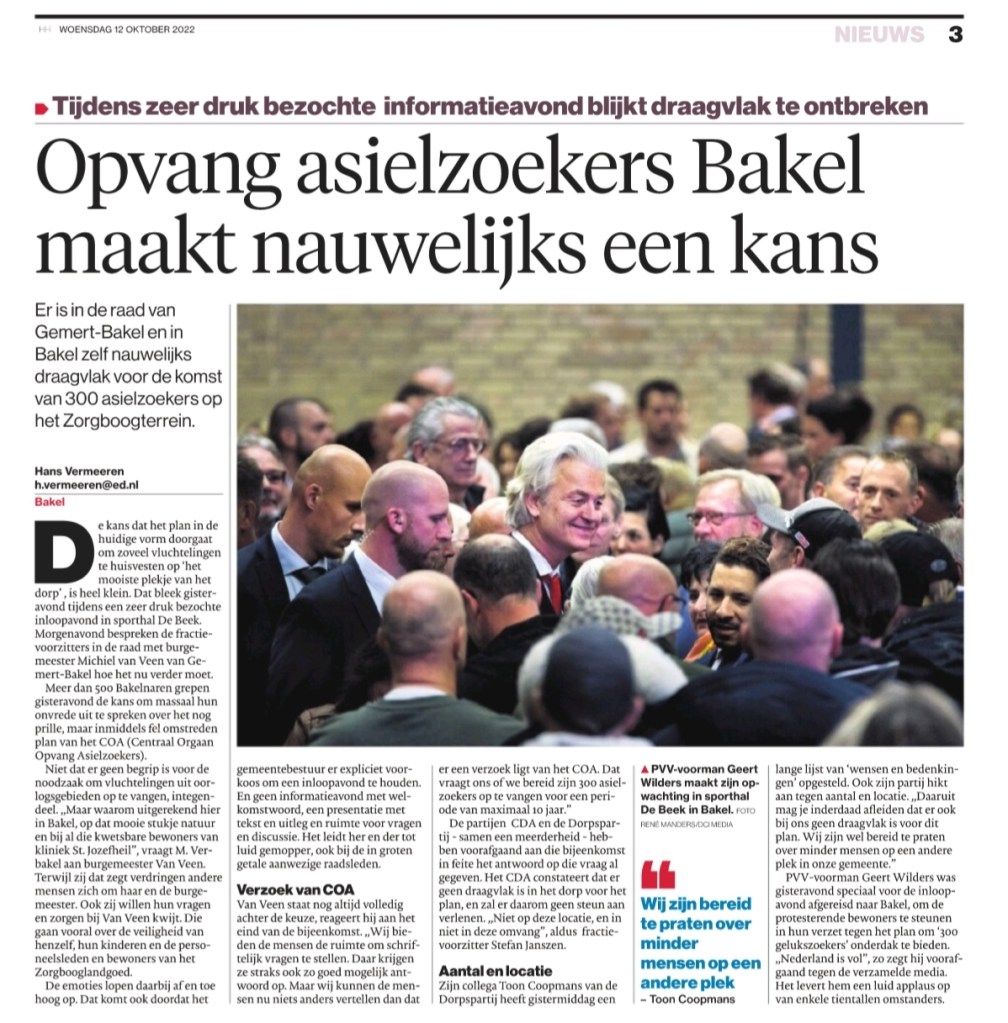 Geert Wilders was er ook. Maar het ging gisteravond natuurlijk om wat de Bakelnaren er van vinden, van de plannen voor een AZC in hun dorp. En daar voelen ze helemaal niets voor.