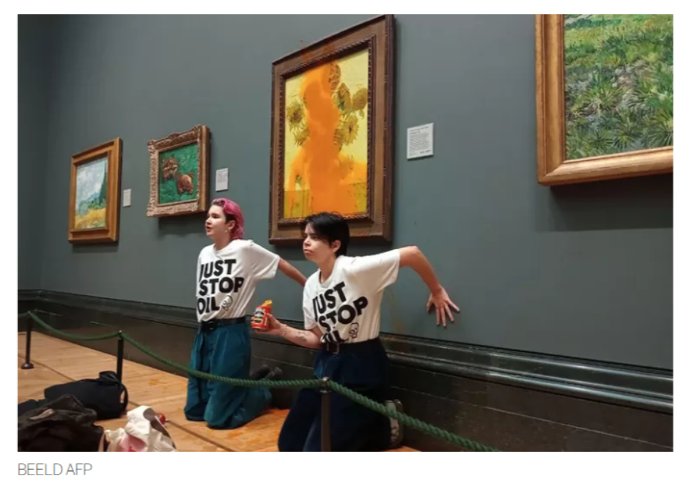 Wat een barbaarse actie! Tomatensoep over de Zonnebloemen gieten als je actie voert tegen de stijgende kosten van het levensonderhoud. Zonde van de soep. En van het schilderij ook, trouwens.