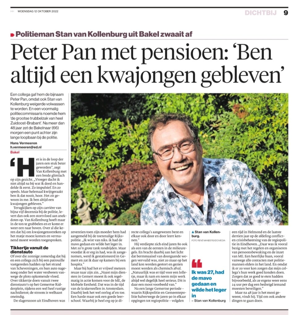 Toen ik bij de krant begon, in 1988, was Stan van Kollenburg al een gepokte en gemazelde politieman. Ik schreef destijds – net als nu – onder meer over Gemert. En maakte ik een serie verhalen over een zaak die hij aan het licht wist te brengen. Namelijk dat bermmaaisel van doorgaande wegen toch echt chemisch afval was. Deze week tekende ik zijn afscheidsverhaal als politieman op.