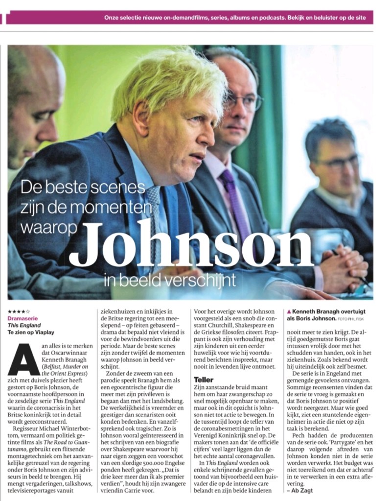 Deze zeer positieve recensie was voor ons de aanleiding aan deze serie te beginnen, gisteravond. En ik moet zeggen: de manier waarop in This England de hoofdrolspelers Boris Johnson en Dominic Cummings worden weggezet, is zeer attractief bewonderenswaardig. Maar vooral ontluisterend.