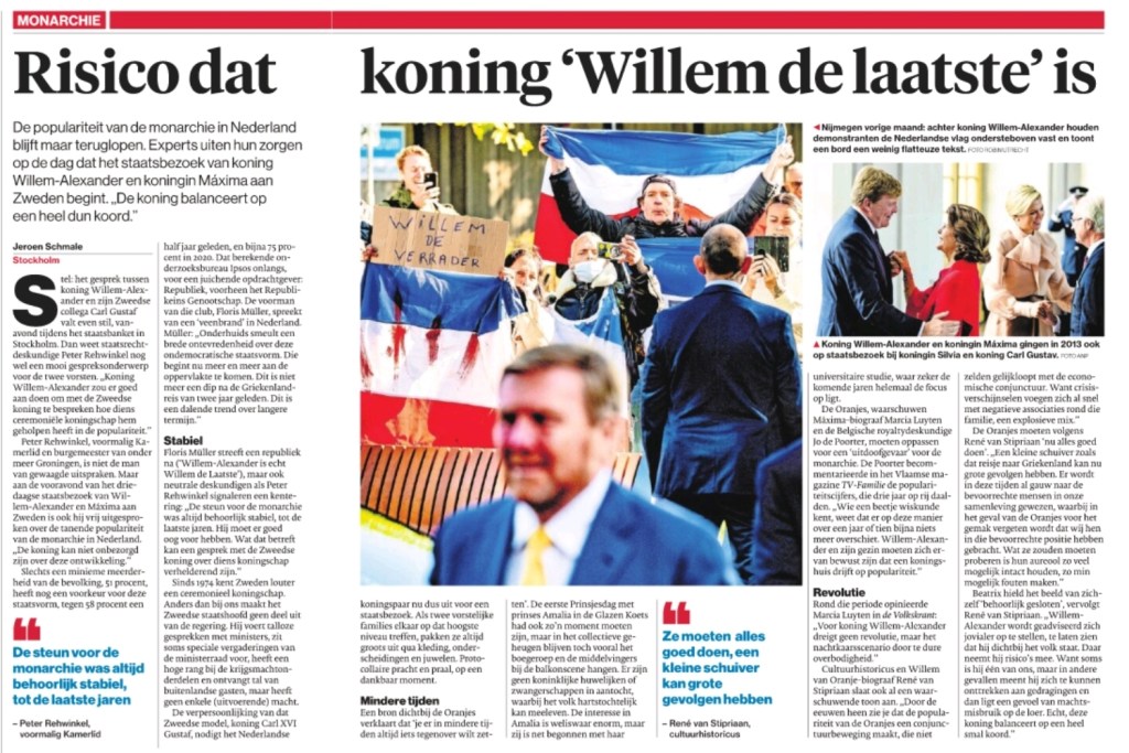 Een geniale vondst, vandaag in onze krant: wordt Willem-Alexander straks koning Willem de Laatste? Mij spreekt dat uiteraard wel aan, als principieel aanhanger van de republieke staatsvorm. Het doet me dan ook goed om te lezen dat steeds meer mensen steeds meer moeite krijgen met het koningshuis.