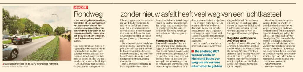 Het doorgaand verkeer uit Helmond weren zonder nieuwe wegen aan te leggen rondom de stad? Dat lijkt mij een utopie.