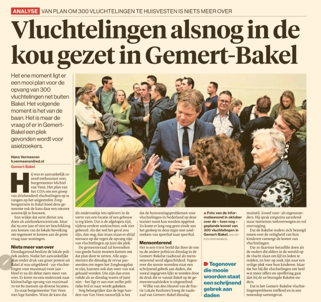Er is voorlopig een einde gekomen aan de discussie over het opvangen van vluchtelingen in de gemeente Gemert-Bakel, op het Zorgboogterrein in Bakel. De vluchtelingen komen er voorlopig niet, en misschien wel helemaal niet. Het debat daarover laat een nare smaak achter.