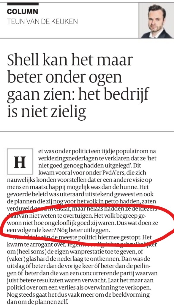 Interessante column van Teun van der Keuken, gisterochtend in de Volkskrant. Waarin hij voormalig topman Jeroen van der Veer van Shell even de maat neemt, naar aanleiding van diens klaaginterview vorige week in een andere landelijke krant, NRC.