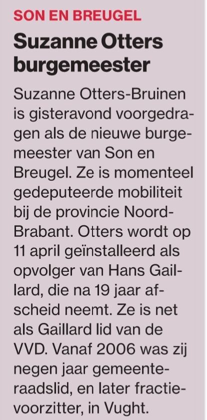 Mooi nieuws voor gedeputeerde Suzanne Otters, en voor de gemeente Son en Breugel. Maar aan goed nieuws zit vaak ook een andere kant. Zo ook in dit geval. Begin vorig jaar vertrok de toenmalige gedeputeerde Christophe van der Maat om staatssecretaris van Defensie te worden. Otters was zijn opvolger. Een jaar later vertrek ook zij nu, dus.