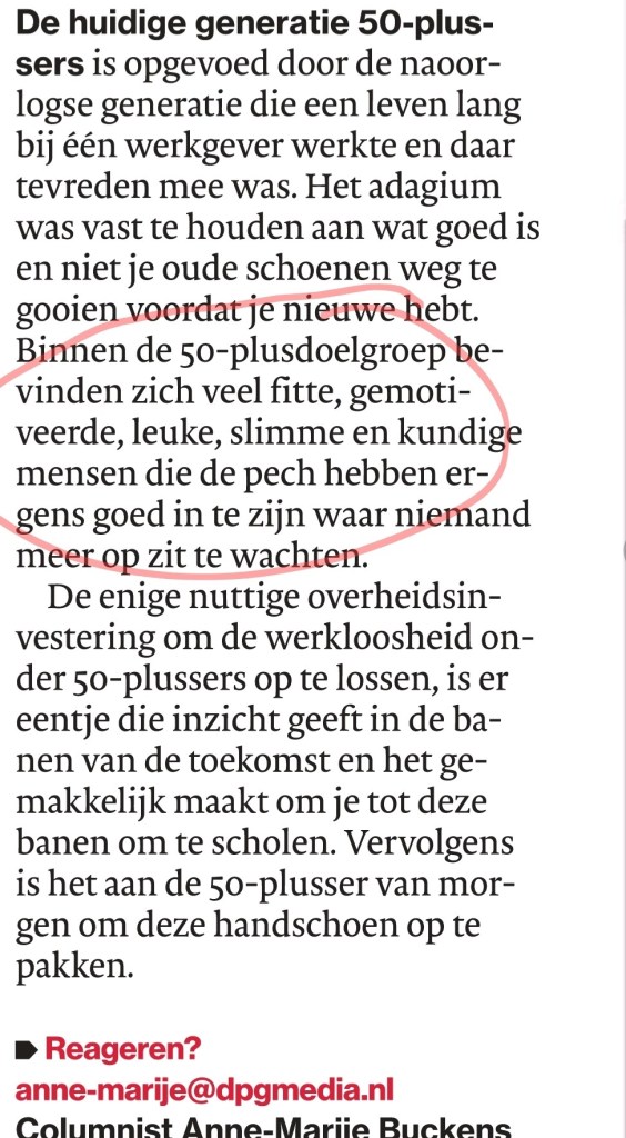 Over de oorzaak waarom vijftigplussers het momenteel zo slecht doen op de arbeidsmarkt: ze kunnen iets heel goed waar niemand meer op zit te wachten. Blij dat ik inmiddels zestigplusser ben.
