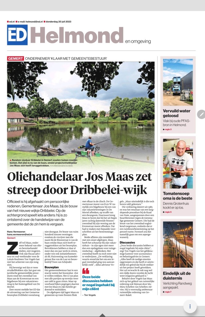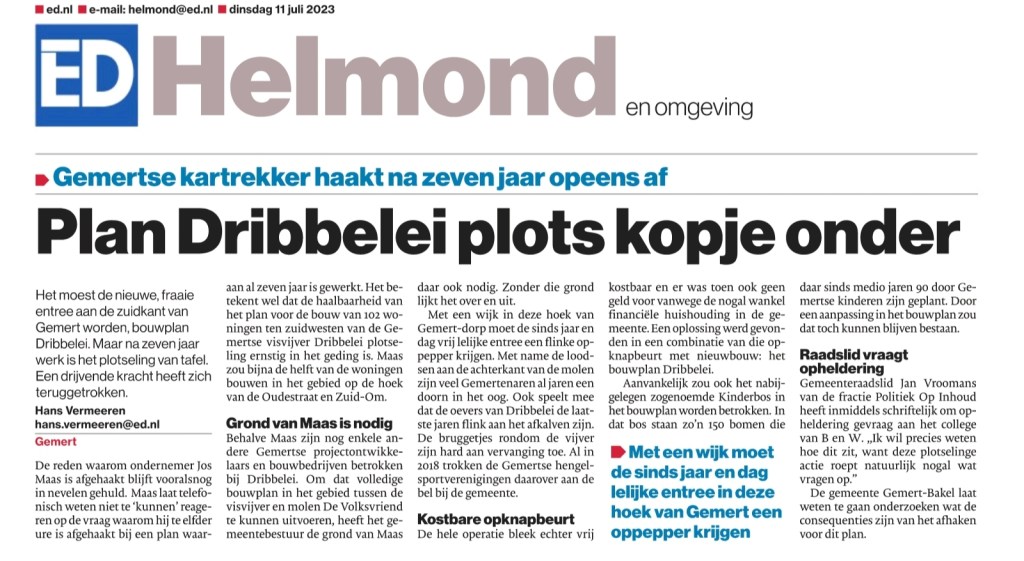 Laatst schreef ik al over het stranden van het bouwproject Dribbelei in Gemert. In de krant van vandaag een verhaal over wat er zich achter de schermen heeft afgespeeld de laatste tijd.