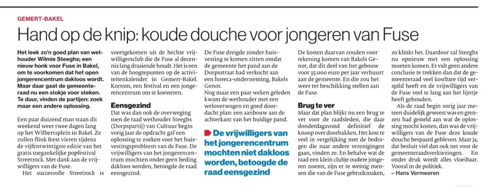 Al veel over geschreven de afgelopen jaren, over jongerencentrum de Fuse in Bakel. En het onderwerp blijft actueel nu de gemeenteraad niets blijkt te voelen voor nieuwbouw.