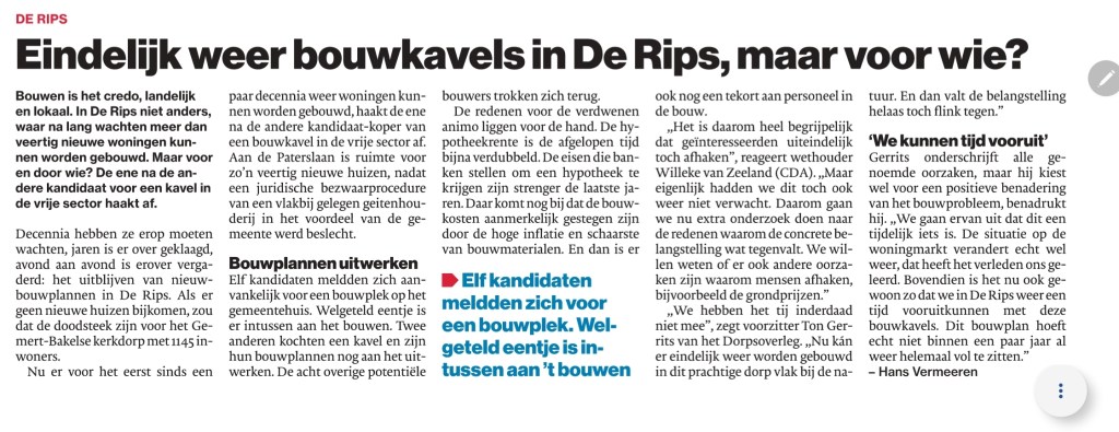Het ging er al jaren over in De Rips, over het uitblijven van de mogelijkheid om er nieuwe huizen te bouwen. Maar nu dat weer kan, blijkt de animo gering. En dat ligt niet aan de inwoners van het dorpje zelf, maar vooral aan de ontwikkelingen op de woningmarkt. Lees hier de digitale versie.