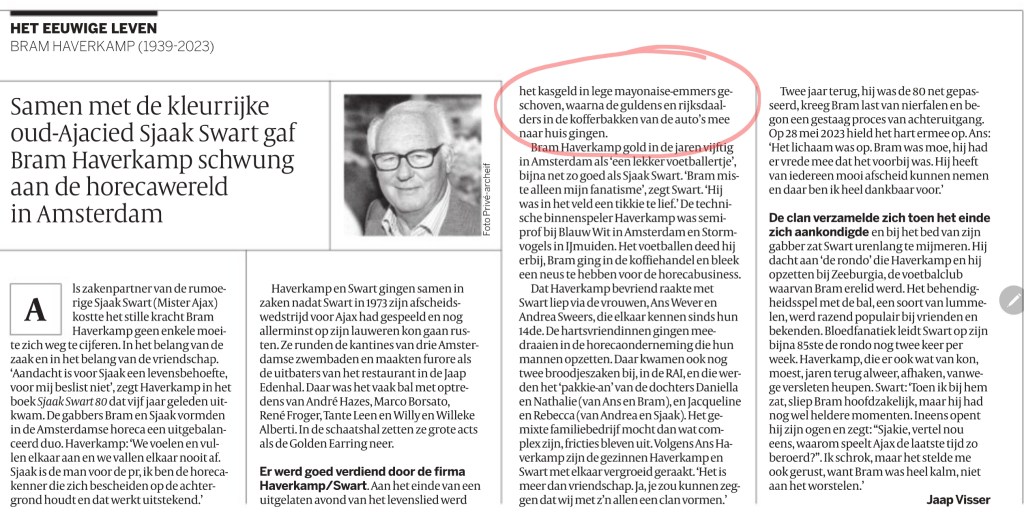 Prachtig tijdsbeeld van de horeca in vervlogen tijden, vandaag in de Volkskrant: guldens en rijksdaalders die aan het eind van de avond in lege mayonaise-emmers in de kofferbak van de auto worden gezet.