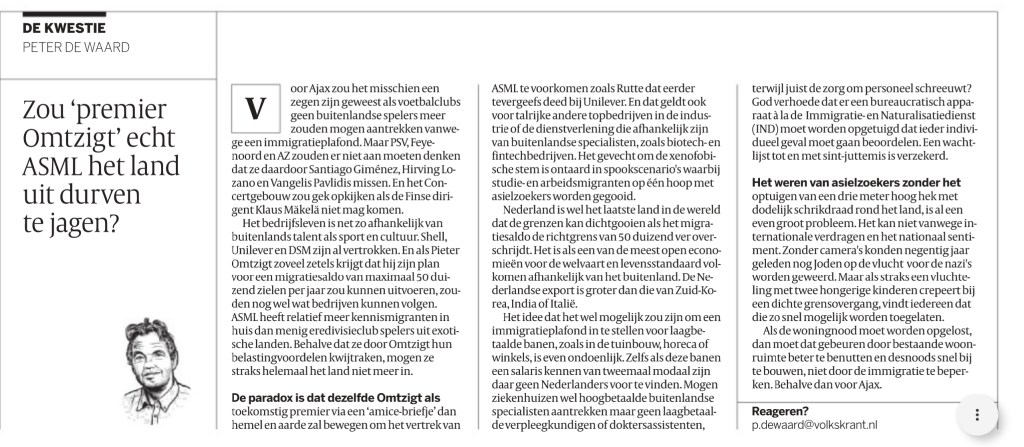 Toeval bestaat niet. Gisteren hadden we een discussie hier op de ED-redactie over de gevolgen van het verkiezingsprogram van Pieter Omtzigt voor ASML en Brainport. Vandaag schrijft Peter de Waard in de Volkskrant exact op wat die gevolgen zijn.