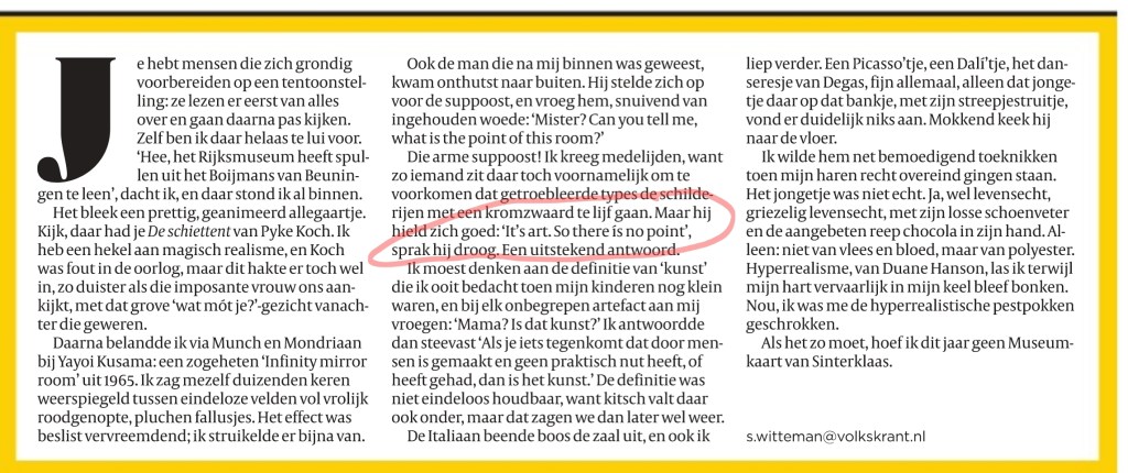 Prachtig citaat vandaag in de column van Sylvia Witteman. Opgetekend uit de mond van een suppoost in het Rijksmuseum, als antwoord op de vraag van een bezoeker naar de betekenis van een bepaald kunstwerk.