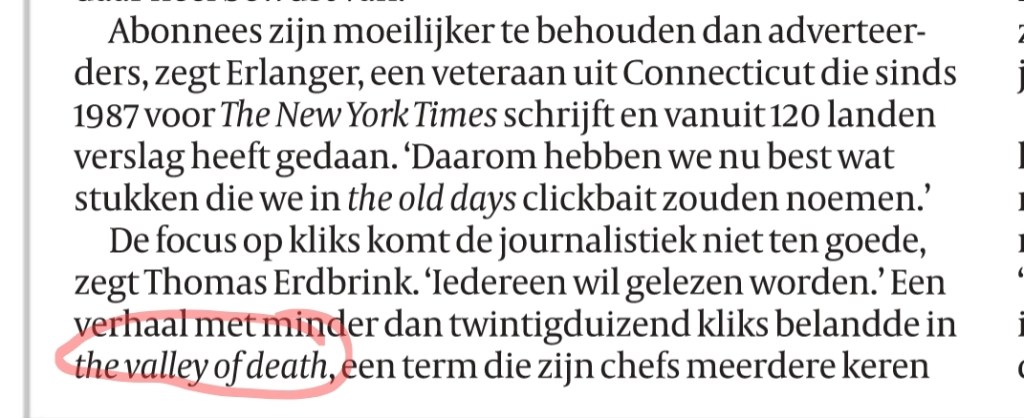 Fascinerend verhaal over de New York Times, vandaag in de Volkskrant. Verhalen op de website van deze krant die niet goed worden gelezen, belanden in de Valley Of Death, lees ik in dat artikel.