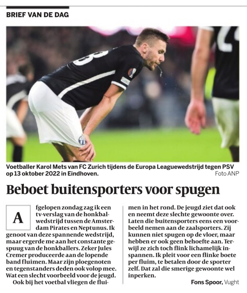 Een boete op spugen lijkt me eerlijk gezegd wel wat te ver gaan. Daarom wil ik eigenlijk een compromis voorstellen: breng de spugende sporters gewoon niet meer in beeld.