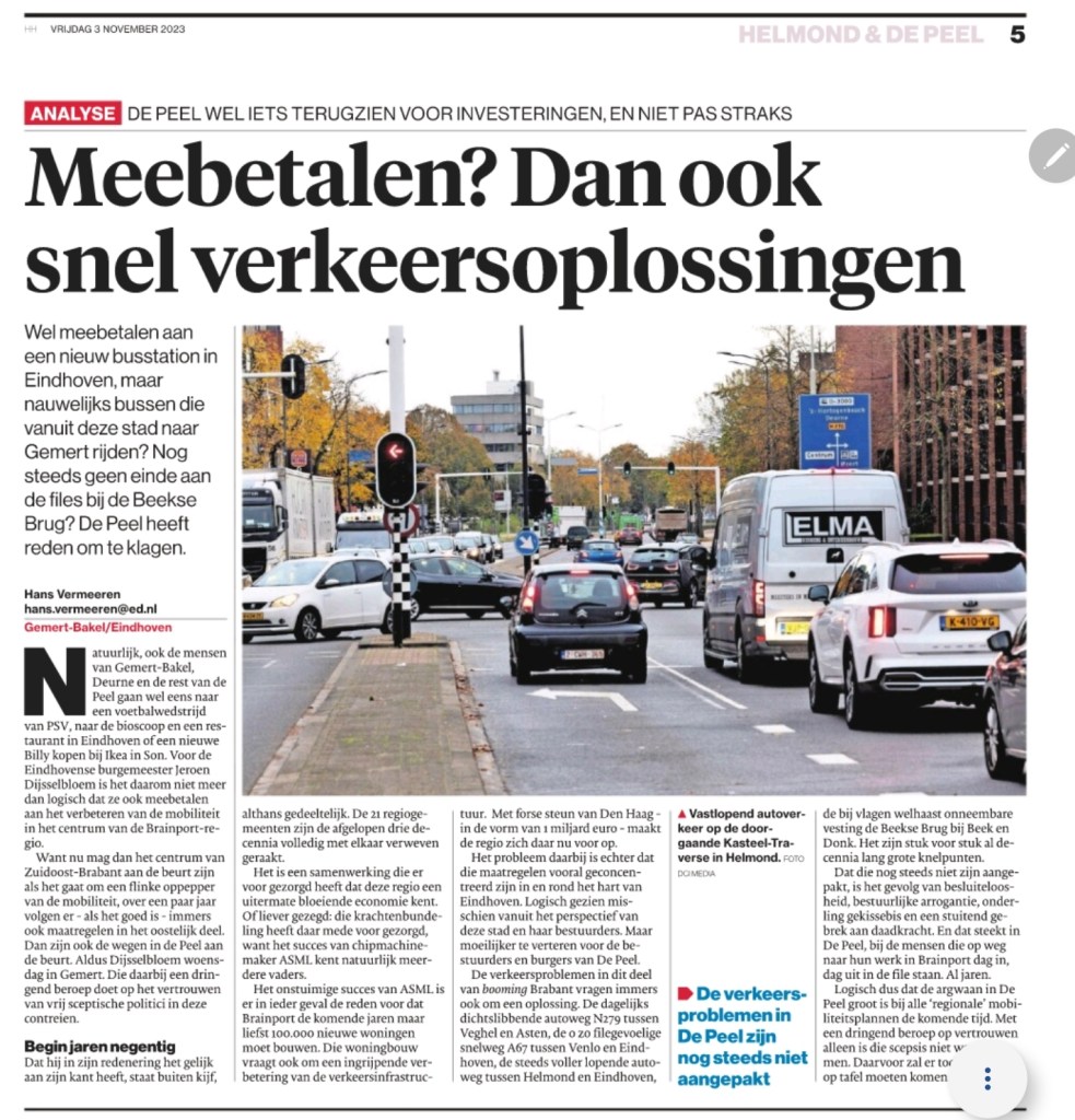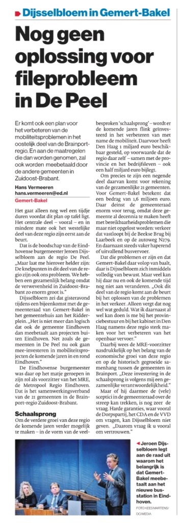 Dijsselbloem vindt het niet meer dan logisch dat Gemert-Bakel en andere plattelandsgemeenten meebetalen aan het verbeteren van de mobiliteit in het centrum van de regio met het oog op de aanstaande ‘schaalsprong’ – de bouw van 100.000 nieuwe huizen – in Brainport.