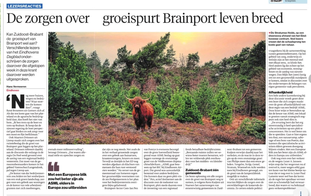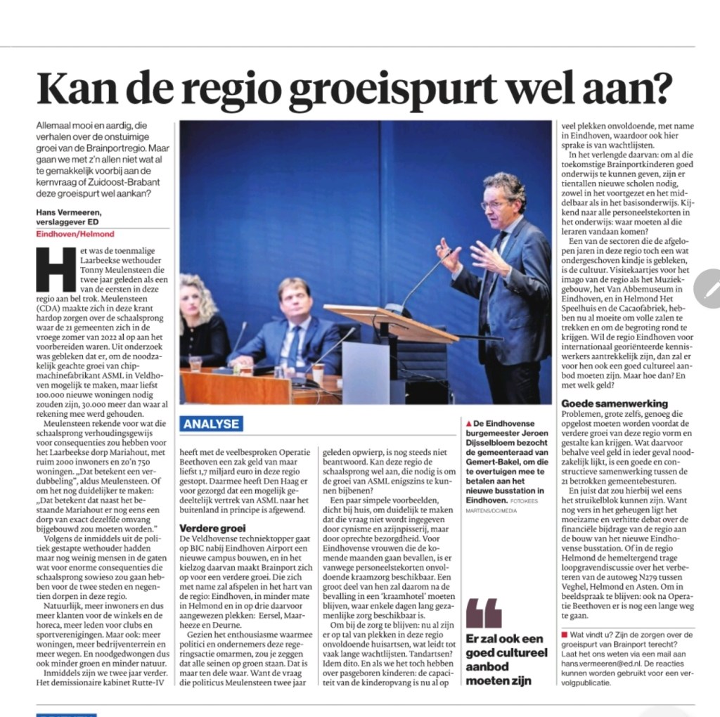 Vorige week sprak op de opiniepagina in onze krant mijn zorgen uit over de groeispurt van Brainport: kunnen we die wel aan, die groei met 100.000 nieuwe woningen.