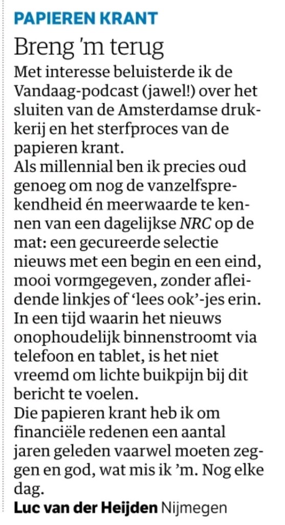 Ingezonden brief in NRC van dinsdag. Een nieuwsselectie met een begin en een eind, mooi vormgegeven en zonder afleiding. Ideaal, zo’n papieren krant.