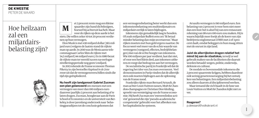 Belasting voor de rijken op bezit in plaats van op inkomen. Peter de Waard legt in de Volkskrant vandaag haarfijn uit waarom dat een heel goed idee is.
