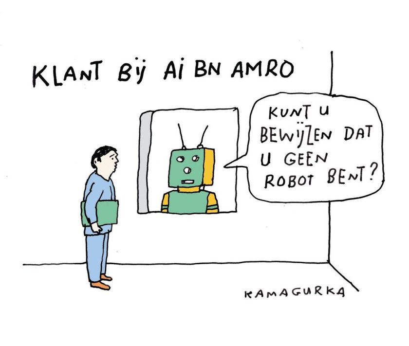 Kamagurka reageert in NRC op de reorganisatieplannen bij een grote, winstgevende bank.