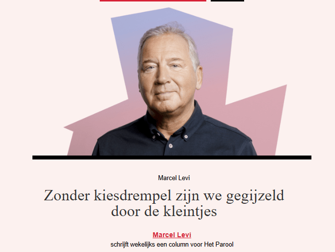 Is dat de oplossing om de stilstand in de politiek een zetje te geven, het verhogen van de kiesdrempel tot 5 zetels? Marcel Levi betoog in zijn column in het Parool van een paar dagen geleden van wel. Ik twijfel. Maar zijn argumenten zijn wel sterk, moet ik zeggen.