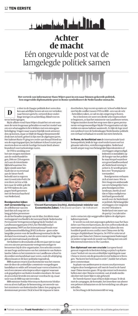 Even fascinerende als verontrustende, wekelijkse rubriek in de Volkkrant: een kijkje achter de schermen bij de machthebbers.