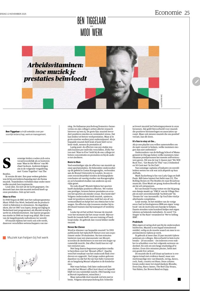 Interessante column van Ben Tiggelaar over de invloed van muziek op werk- en sportprestaties. Die kan best groot zijn, zo vat ik het maar even in mijn eigen woorden samen.