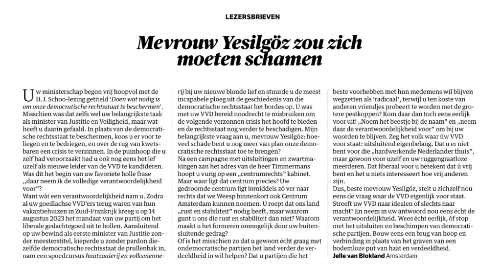 Scherpe ingezonden brief vandaag in NRC. De mening dus van een van die mensen thuis waar het zo vaak over gaat in Den Haag.