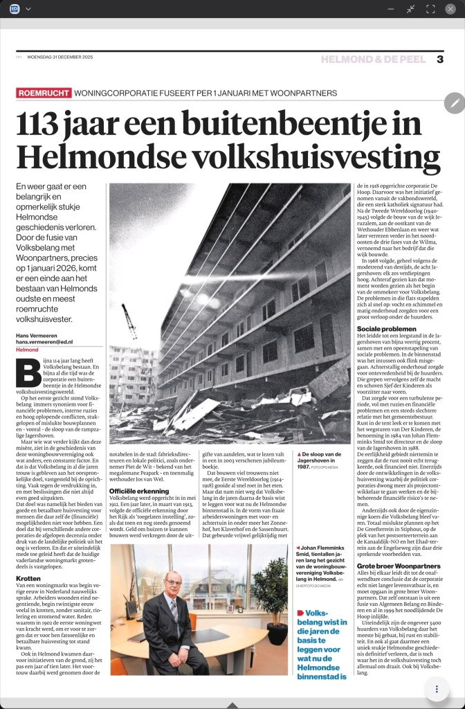 De Helmondse woningbouwvereniging Volksbelang houdt op 1 januari 2026 op te bestaan, na bijna 113 jaar. Vandaag in de krant een terugblik op de geschiedenis van deze roemruchte corporatie.