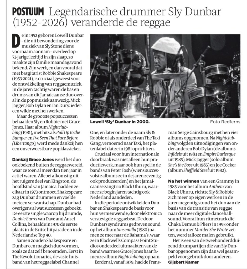 Mooi eerbetoon in de Volkskrant aan de man die samen met bassist Robbie Shakespeare reggae inderdaad veranderde, Sly Dunbar.
