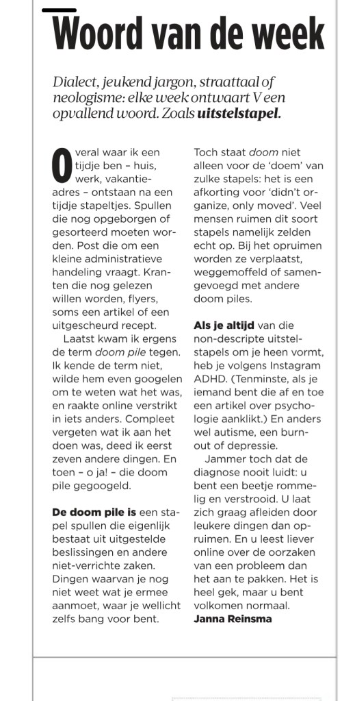 Prachtig woord, je weet ook meteen wat er mee bedoeld wordt: uitstelstapel. Vandaag tegengekomen in de Volkskrant, waar het tot Woord van de Week is gepromoveerd.