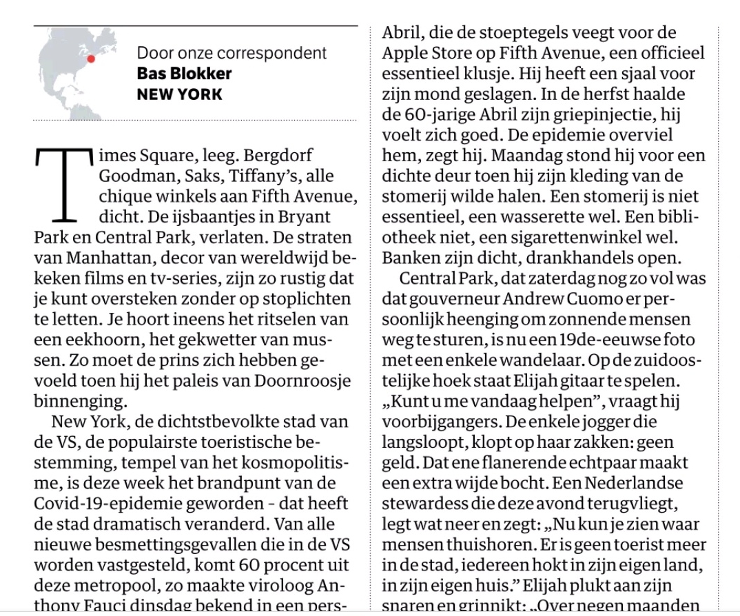 En de zin van de dag komt uit de tekstverwerker van Bas Blokker, NRC-correspondent in de Verenigde Staten. Hij liep verwonderd door een leeg, uitgestorven en verlaten New York en kwam met dit pareltje op de proppen: ,,Zo moet de prins zich hebben gevoeld toen hij het paleis van Doornroosje binnen ging.” Chapeau!