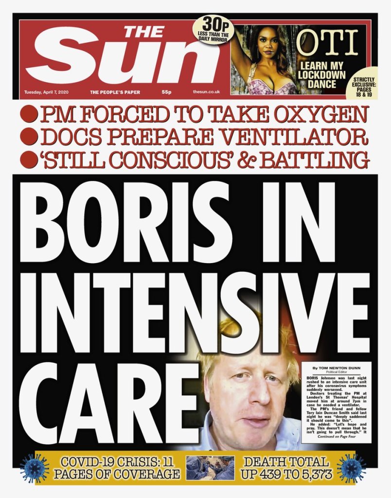 Boris ligt op de intensive care, en daarom staat Boris vandaag ook in de kranten, en wel op de voorpagina’s. Mocht u even ontgaan zijn wie Boris ook al weer is: dat is de Engelse minister-president. Toch mooi als iedereen aan de hand van je voornaam weet wie je bent.