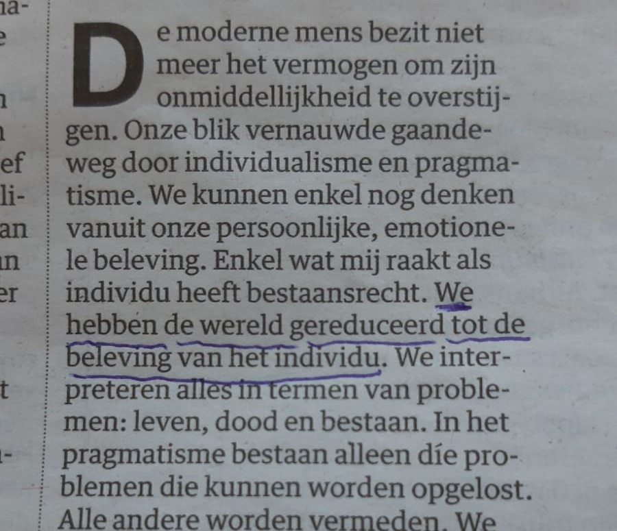 De zin van de dag is al van zaterdag maar te mooi om zo maar te laten passeren. Hij is ingezonden door mijn ED-collega Rob Schoonen, die een scherp oog heeft voor mooie citaten. Dit is em: We hebben de wereld gereduceerd tot de beleving van het individu.