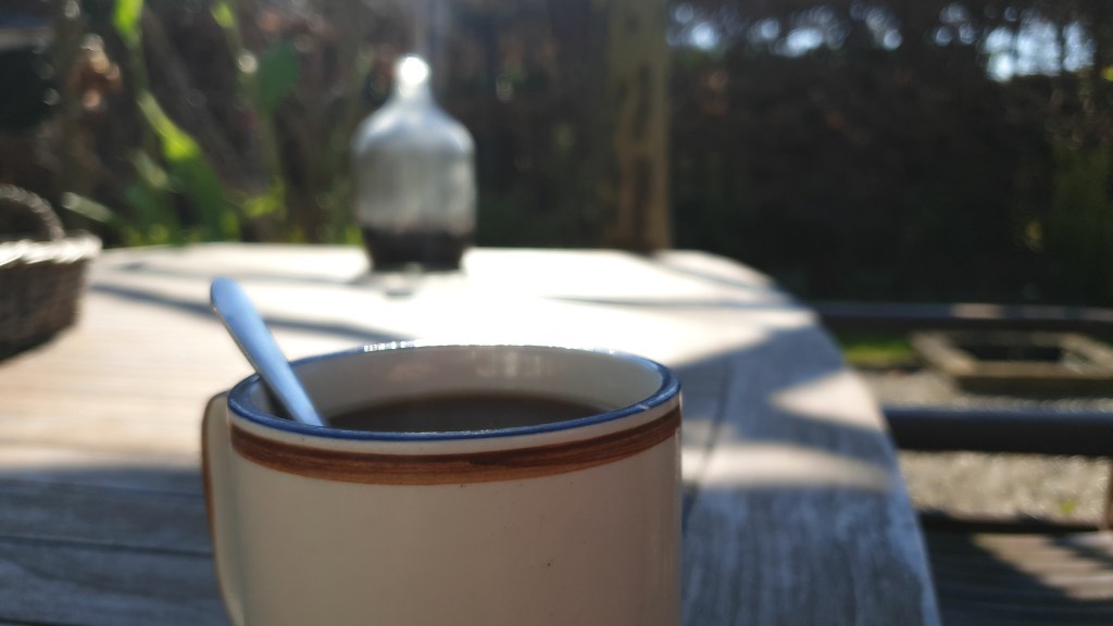 Vandaag wilde ik één voordeel even in de spotlights zetten. En dat is dat je koffiepauze op terras in je eigen tuin kunt houden als de zon schijnt.
