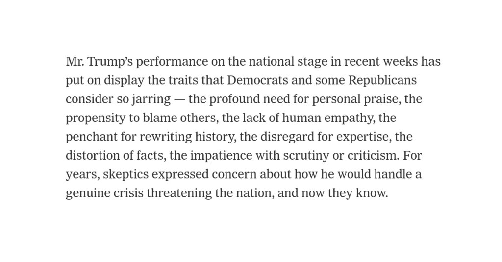 Deze typering komt uit de New York Times en is van Maggie Haberman en Peter Baker, twee journalisten die Trump al jaren volgen en weten waar ze het over hebben.