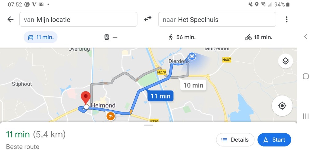 En inderdaad, het is van hieruit 5,4 kilometer naar Het Speelhuis. 56 minuten lopen. Als we met de auto gaan valt het nog mee, dan is het 11 minuten rijden. Maar het blijft een flinke afstand.