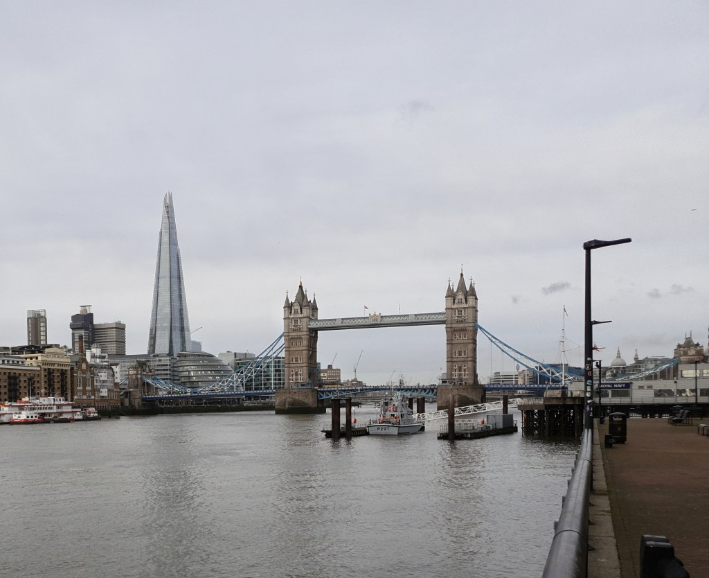 Van daaruit is het een half uurtje lopen naar de Tower Bridge: een heerlijke wandeling langs de Theems, die zo bochtig is dat voor dat je het weet je met je neus voor de brug staat.