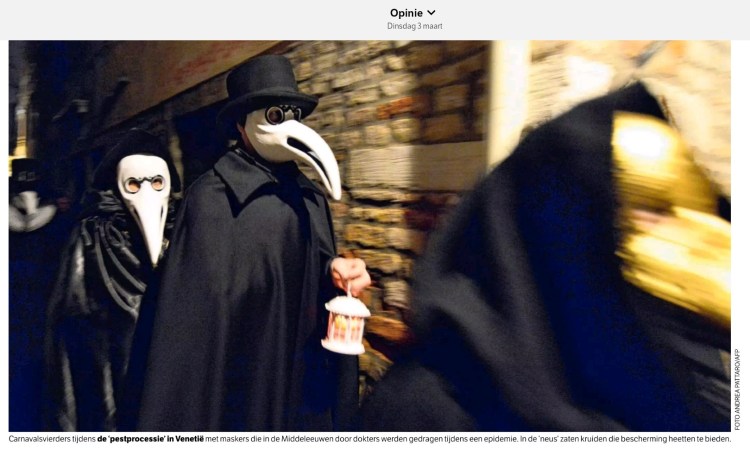 Prachtige foto, eerder deze week in de Volkskrant, gemaakt tijdens het Venetiaanse carnaval. De link met het corona-virus is natuurlijk snel gelegd. Zelf had ik vooral een associatie met de tv-serie Floris, waar ik in mijn jeugd maar al te graag naar keek. In zwart-wit, trouwens. Dat wel.