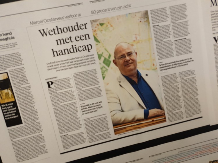 De Eindhovense wethouder Marcel Oosterveer heeft te kampen met een sterk teruglopend gezichtsvermogen. Voor de krant sprak ik hem uitgebreid over de gevolgen daarvan voor zijn werk. Morgen staat de schriftelijke weerslag van dat openhartige gesprek in de wekelijkse zaterdagbijlage.